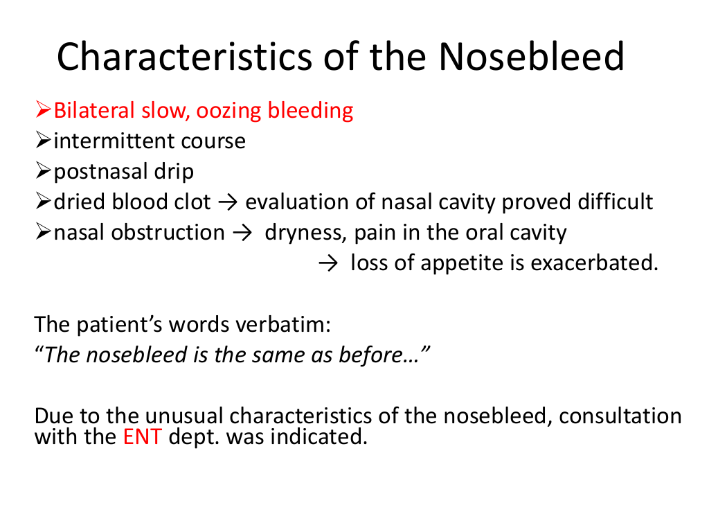 #11. Characteristics of the Nosebleed Bilateral slow, oozing bleeding intermittent course postnasal drip dried blood clot → evaluation of nasal cavity proved difficult nasal obstruction → dryness, pain in the oral cavity → loss of appetite is exacerbated. The patient’s words verbatim: “The nosebleed is the same as before…” Due to the unusual characteristics of the nosebleed, consultation with the ENT dept. was indicated.