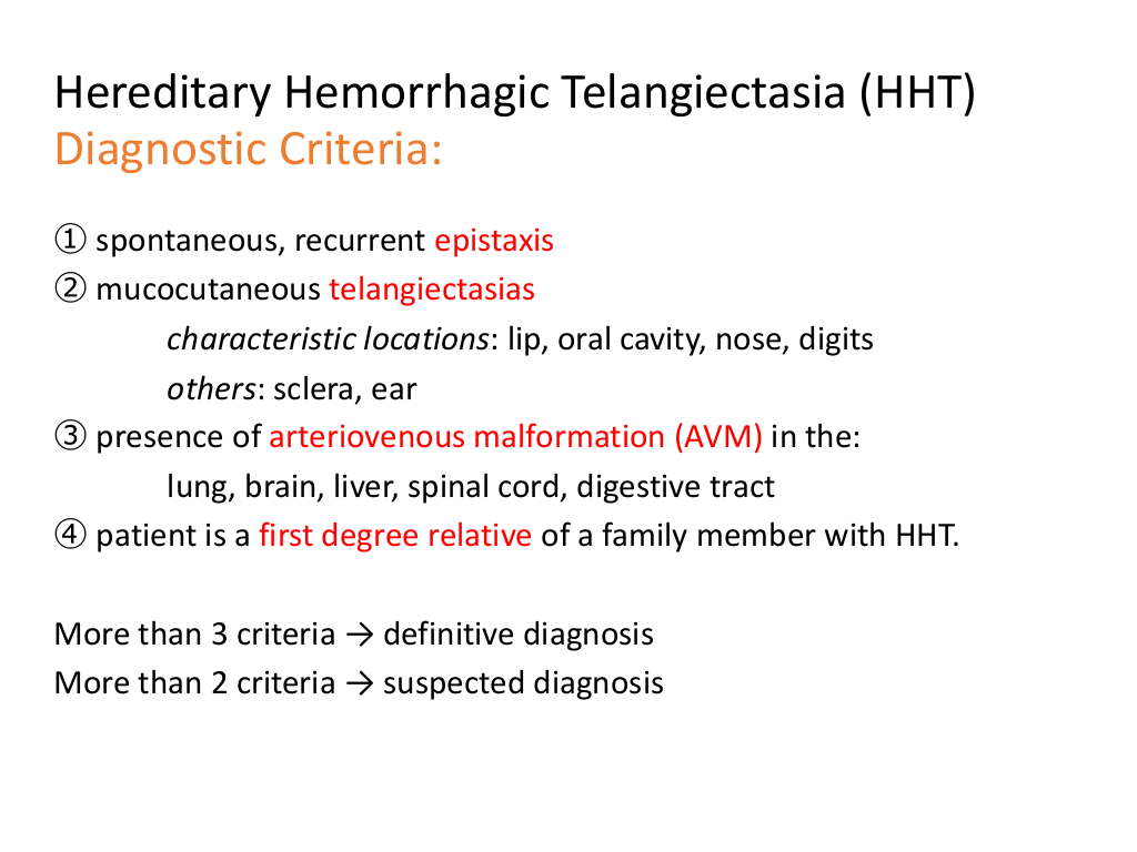 #14. Hereditary Hemorrhagic Telangiectasia (HHT) Diagnostic Criteria: ① spontaneous, recurrent epistaxis ② mucocutaneous telangiectasias characteristic locations: lip, oral cavity, nose, digits others: sclera, ear ③ presence of arteriovenous malformation (AVM) in the: lung, brain, liver, spinal cord, digestive tract ④ patient is a first degree relative of a family member with HHT. More than 3 criteria → definitive diagnosis More than 2 criteria → suspected diagnosis
