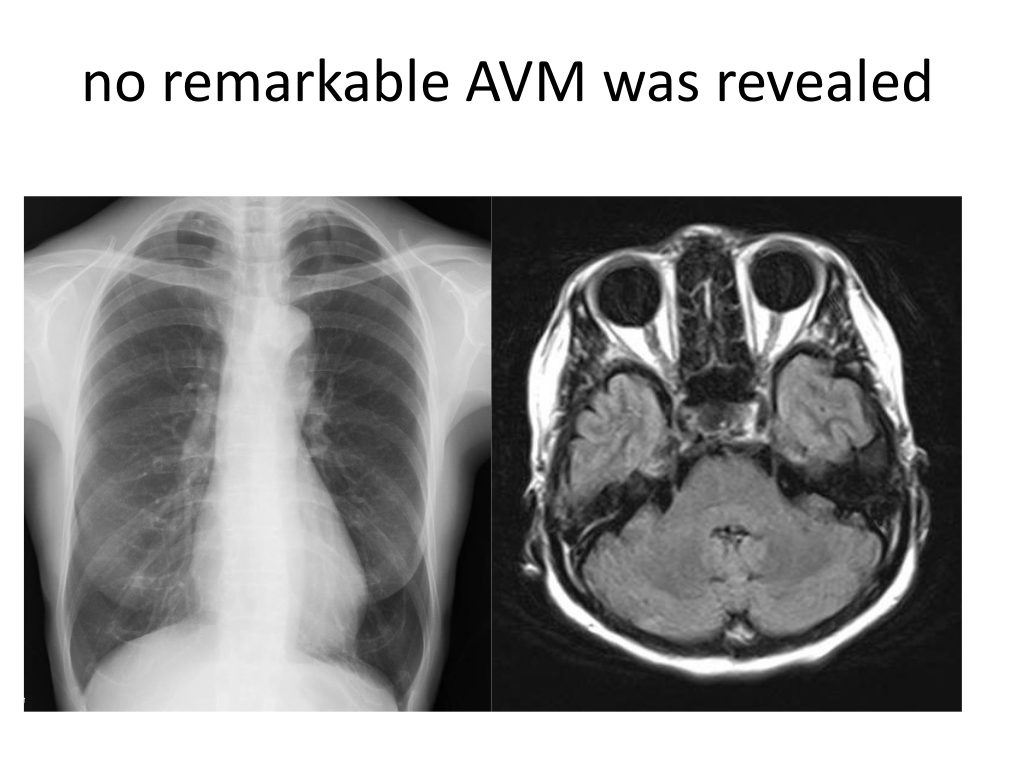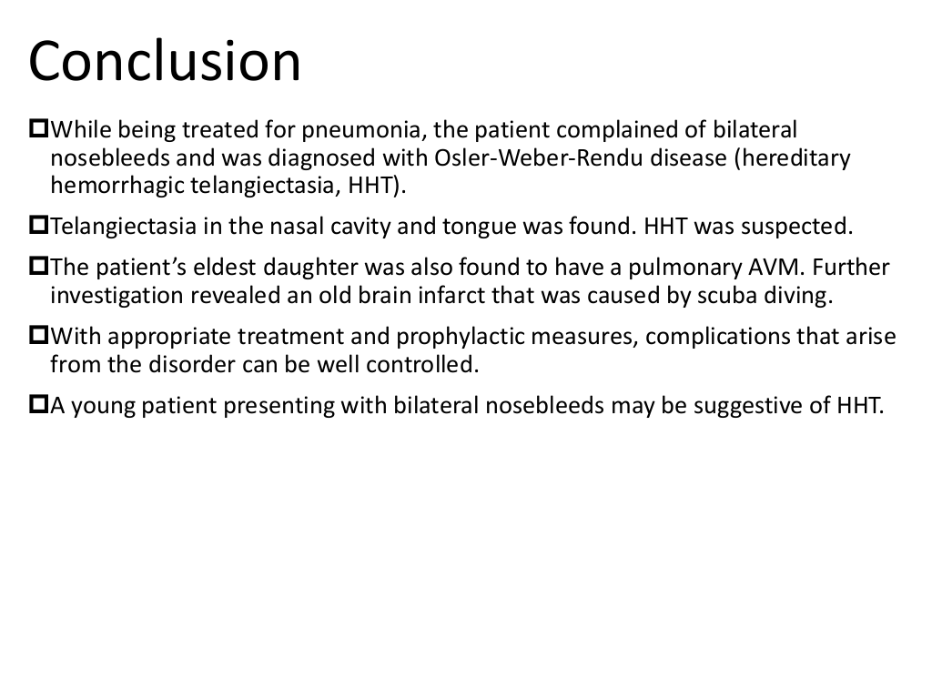 #26. Conclusion While being treated for pneumonia, the patient complained of bilateral nosebleeds and was diagnosed with Osler-Weber-Rendu disease (hereditary hemorrhagic telangiectasia, HHT). Telangiectasia in the nasal cavity and tongue was found. HHT was suspected. The patient’s eldest daughter was also found to have a pulmonary AVM. Further investigation revealed an old brain infarct that was caused by scuba diving. With appropriate treatment and prophylactic measures, complications that arise from the disorder can be well controlled. A young patient presenting with bilateral nosebleeds may be suggestive of HHT.