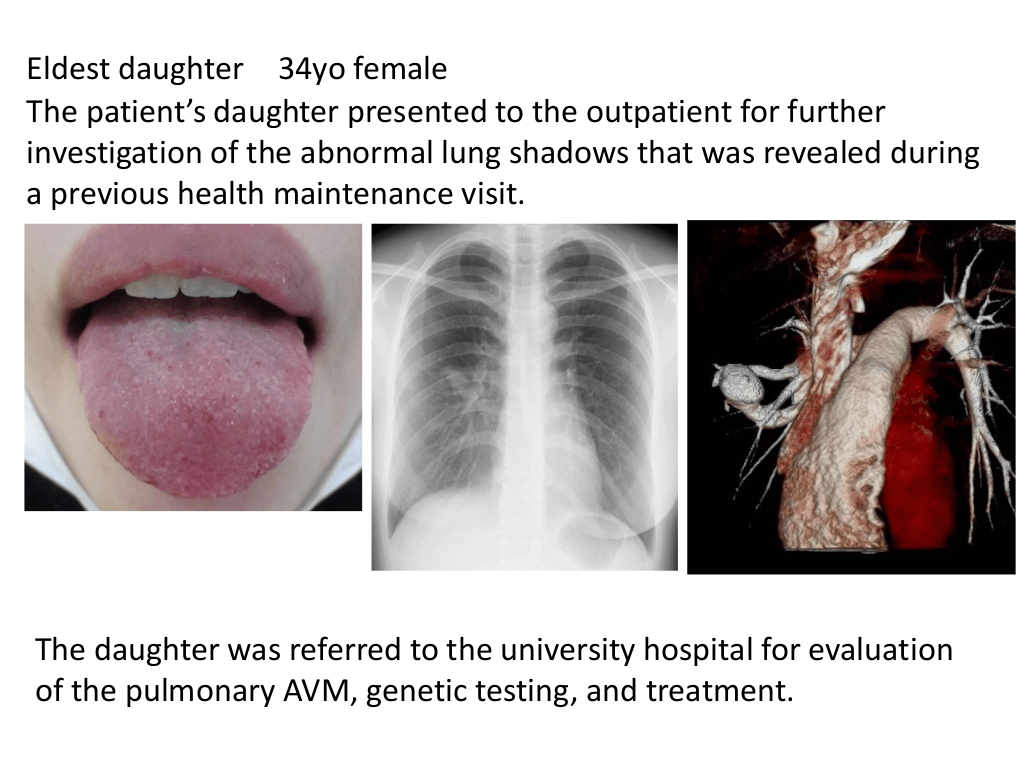 #16. Eldest daughter 34yo female The patient’s daughter presented to the outpatient for further investigation of the abnormal lung shadows that was revealed during a previous health maintenance visit. The daughter was referred to the university hospital for evaluation of the pulmonary AVM, genetic testing, and treatment.