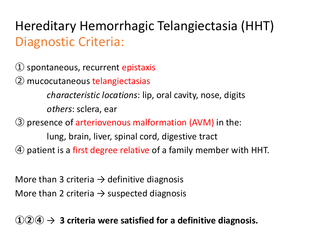 #17. Hereditary Hemorrhagic Telangiectasia (HHT) Diagnostic Criteria: ① spontaneous, recurrent epistaxis ② mucocutaneous telangiectasias characteristic locations: lip, oral cavity, nose, digits others: sclera, ear ③ presence of arteriovenous malformation (AVM) in the: lung, brain, liver, spinal cord, digestive tract ④ patient is a first degree relative of a family member with HHT. More than 3 criteria → definitive diagnosis More than 2 criteria → suspected diagnosis ①②④ → 3 criteria were satisfied for a definitive diagnosis.