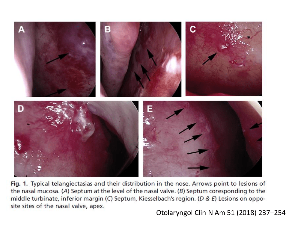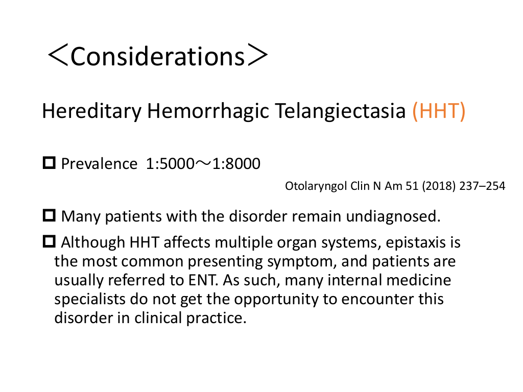 #18. <Considerations> Hereditary Hemorrhagic Telangiectasia (HHT) Prevalence 1:5000~1:8000 Otolaryngol Clin N Am 51 (2018) 237–254 Many patients with the disorder remain undiagnosed. Although HHT affects multiple organ systems, epistaxis is the most common presenting symptom, and patients are usually referred to ENT. As such, many internal medicine specialists do not get the opportunity to encounter this disorder in clinical practice.