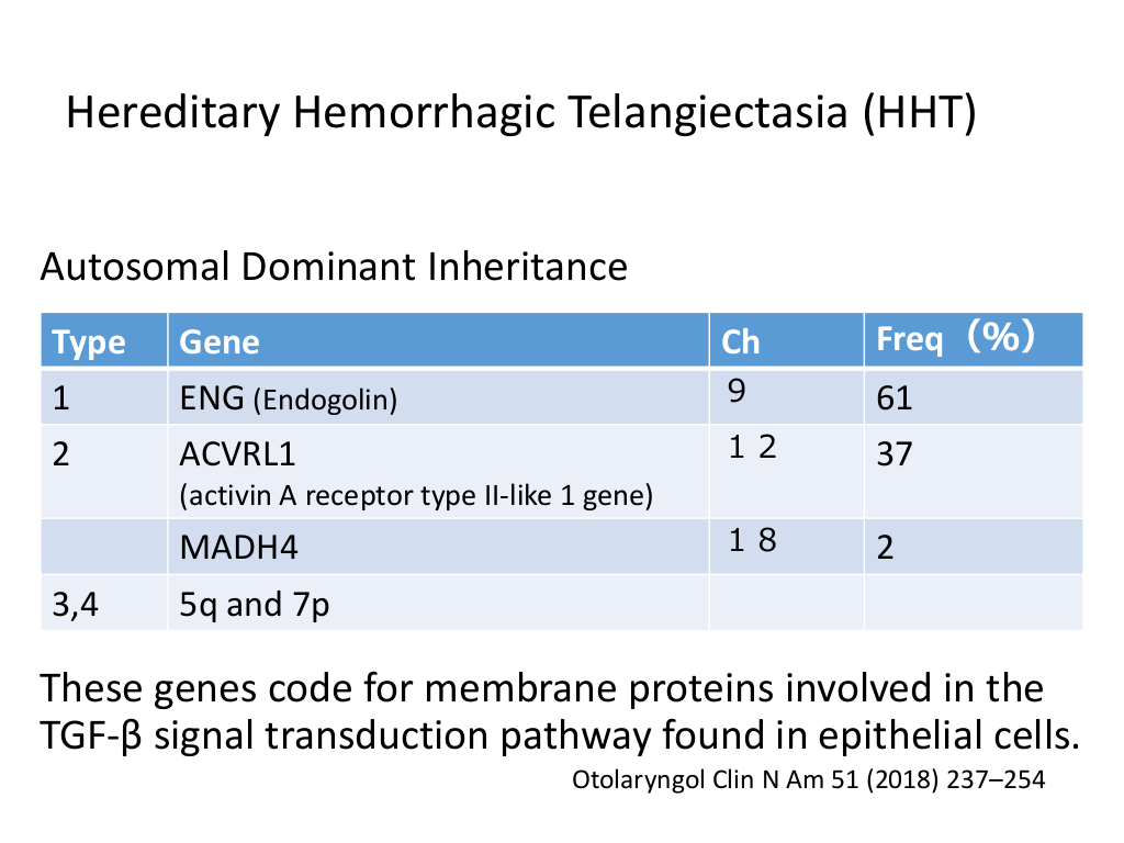 #19. Hereditary Hemorrhagic Telangiectasia (HHT) Autosomal Dominant Inheritance Type 1 Gene ENG (Endogolin) Ch Freq(%) 9 2 ACVRL1 12 61 37 18 2 (activin A receptor type II-like 1 gene) MADH4 3,4 5q and 7p These genes code for membrane proteins involved in the TGF-β signal transduction pathway found in epithelial cells. Otolaryngol Clin N Am 51 (2018) 237–254