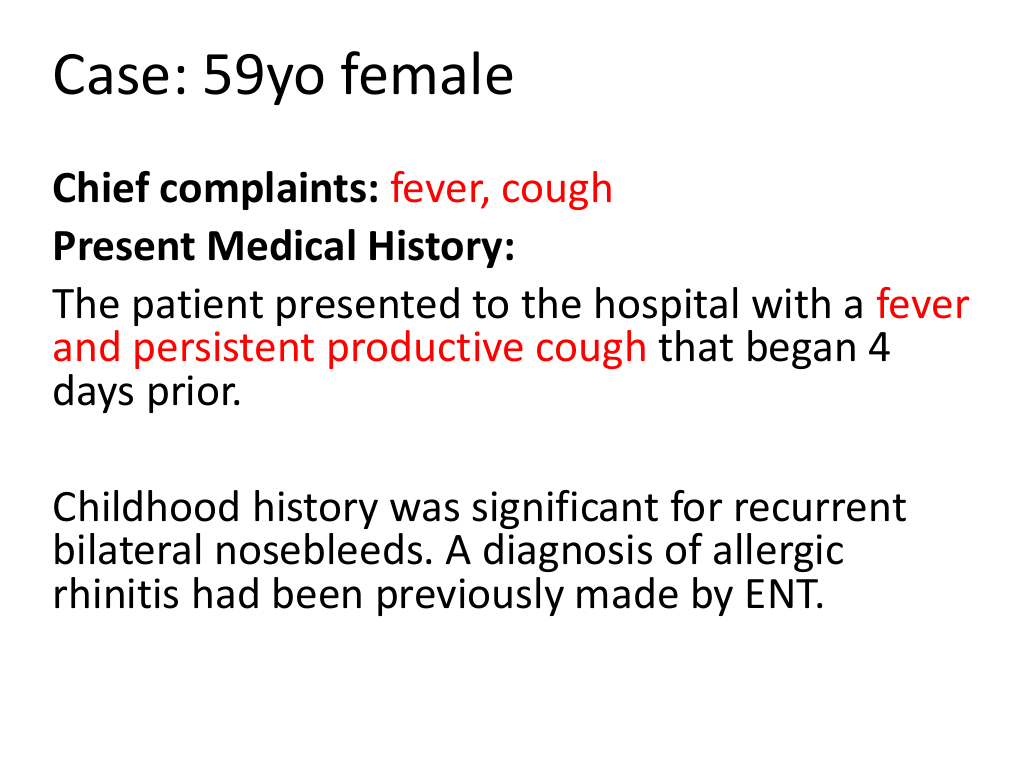 #2. Case: 59yo female Chief complaints: fever, cough Present Medical History: The patient presented to the hospital with a fever and persistent productive cough that began 4 days prior. Childhood history was significant for recurrent bilateral nosebleeds. A diagnosis of allergic rhinitis had been previously made by ENT.