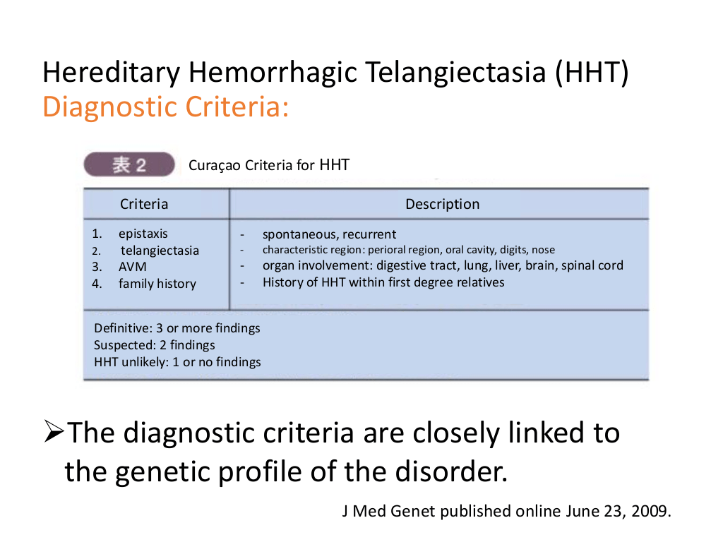 #20. Hereditary Hemorrhagic Telangiectasia (HHT) Diagnostic Criteria: Curaçao Criteria for HHT Criteria 1. 2. 3. 4. epistaxis telangiectasia AVM family history Description - spontaneous, recurrent - characteristic region: perioral region, oral cavity, digits, nose - organ involvement: digestive tract, lung, liver, brain, spinal cord History of HHT within first degree relatives Definitive: 3 or more findings Suspected: 2 findings HHT unlikely: 1 or no findings The diagnostic criteria are closely linked to the genetic profile of the disorder. J Med Genet published online June 23, 2009.