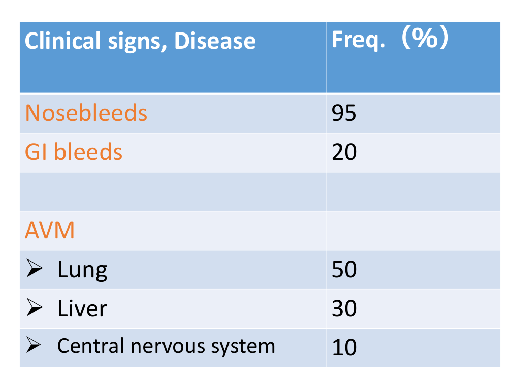 #21. Clinical signs, Disease Freq.(%) Nosebleeds 95 GI bleeds 20 AVM Lung 50 Liver 30 Central nervous system 10
