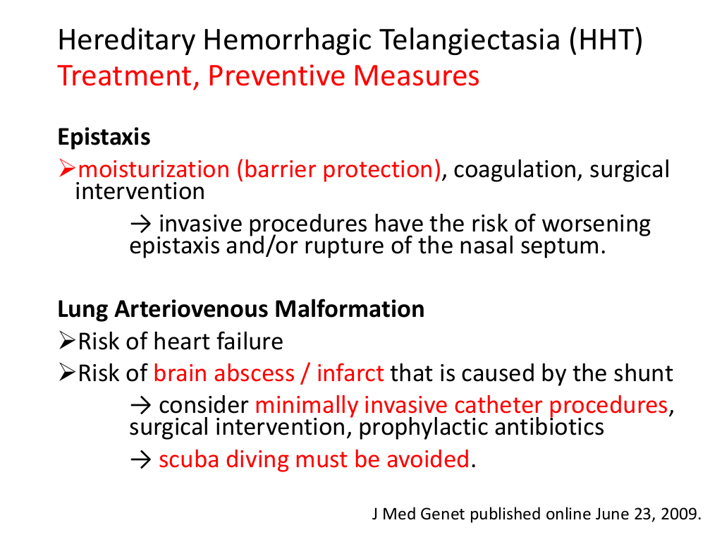 #24. Hereditary Hemorrhagic Telangiectasia (HHT) Treatment, Preventive Measures Epistaxis moisturization (barrier protection), coagulation, surgical intervention → invasive procedures have the risk of worsening epistaxis and/or rupture of the nasal septum. Lung Arteriovenous Malformation Risk of heart failure Risk of brain abscess / infarct that is caused by the shunt → consider minimally invasive catheter procedures, surgical intervention, prophylactic antibiotics → scuba diving must be avoided. J Med Genet published online June 23, 2009.