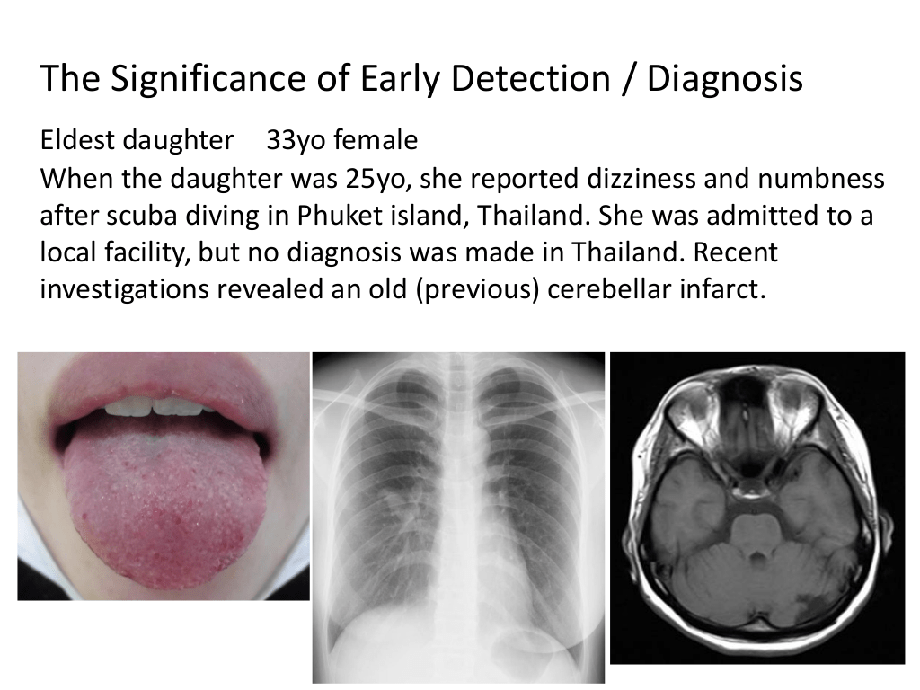#25. The Significance of Early Detection / Diagnosis Eldest daughter 33yo female When the daughter was 25yo, she reported dizziness and numbness after scuba diving in Phuket island, Thailand. She was admitted to a local facility, but no diagnosis was made in Thailand. Recent investigations revealed an old (previous) cerebellar infarct.