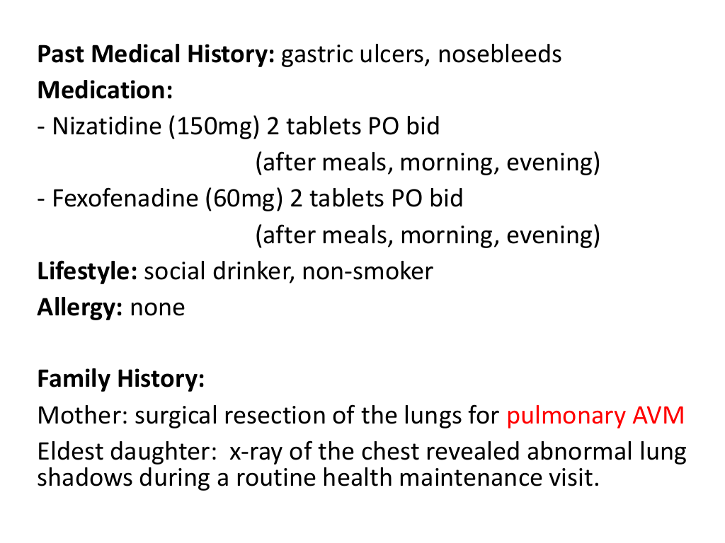 #3. Past Medical History: gastric ulcers, nosebleeds Medication: - Nizatidine (150mg) 2 tablets PO bid (after meals, morning, evening) - Fexofenadine (60mg) 2 tablets PO bid (after meals, morning, evening) Lifestyle: social drinker, non-smoker Allergy: none Family History: Mother: surgical resection of the lungs for pulmonary AVM Eldest daughter: x-ray of the chest revealed abnormal lung shadows during a routine health maintenance visit.