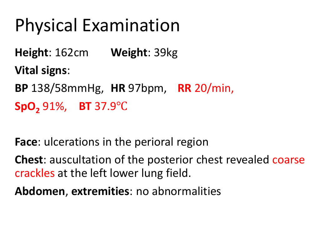 #4. Physical Examination Height: 162cm Weight: 39kg Vital signs: BP 138/58mmHg, HR 97bpm, RR 20/min, SpO2 91%, BT 37.9℃ Face: ulcerations in the perioral region Chest: auscultation of the posterior chest revealed coarse crackles at the left lower lung field. Abdomen, extremities: no abnormalities