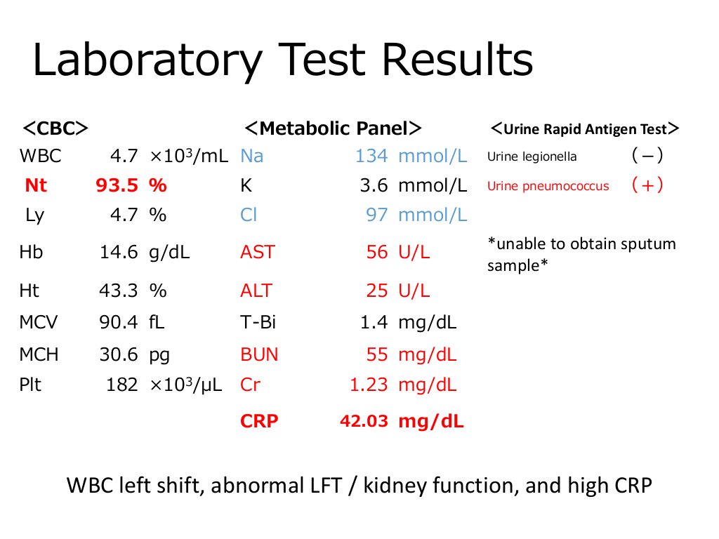 #5. Laboratory Test Results <CBC> WBC <Metabolic Panel> 4.7 ×103/mL Na 134 mmol/L Nt 93.5 % K 3.6 mmol/L Ly 4.7 % Cl 97 mmol/L Hb 14.6 g/dL AST 56 U/L Ht 43.3 % ALT 25 U/L MCV 90.4 fL T-Bi 1.4 mg/dL MCH 30.6 pg BUN 55 mg/dL Plt 182 ×103/μL Cr CRP <Urine Rapid Antigen Test> Urine legionella (-) Urine pneumococcus (+) *unable to obtain sputum sample* 1.23 mg/dL 42.03 mg/dL WBC left shift, abnormal LFT / kidney function, and high CRP