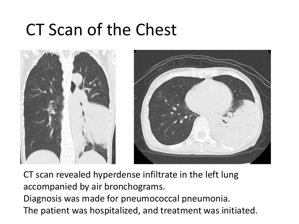 #7. CT Scan of the Chest CT scan revealed hyperdense infiltrate in the left lung accompanied by air bronchograms. Diagnosis was made for pneumococcal pneumonia. The patient was hospitalized, and treatment was initiated.