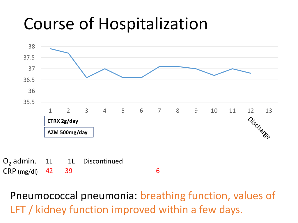 #8. Course of Hospitalization 38 37.5 37 36.5 36 35.5 1 2 3 4 5 6 7 8 9 10 11 12 13 CTRX 2g/day AZM 500mg/day O2 admin. 1L CRP (mg/dl) 42 1L 39 Discontinued 6 Pneumococcal pneumonia: breathing function, values of LFT / kidney function improved within a few days.