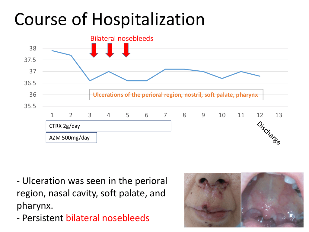 #9. Course of Hospitalization Bilateral nosebleeds 38 37.5 37 36.5 36 Ulcerations of the perioral region, nostril, soft palate, pharynx 35.5 1 2 3 4 5 6 7 CTRX 2g/day AZM 500mg/day - Ulceration was seen in the perioral region, nasal cavity, soft palate, and pharynx. - Persistent bilateral nosebleeds 8 9 10 11 12 13