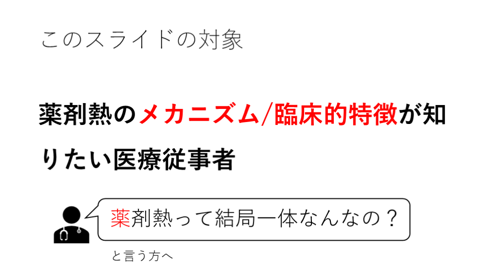 #3. このスライドの対象 薬剤熱のメカニズム/臨床的特徴が知りたい医療従事者 薬剤熱って結局一体なんなの? と言う方へ