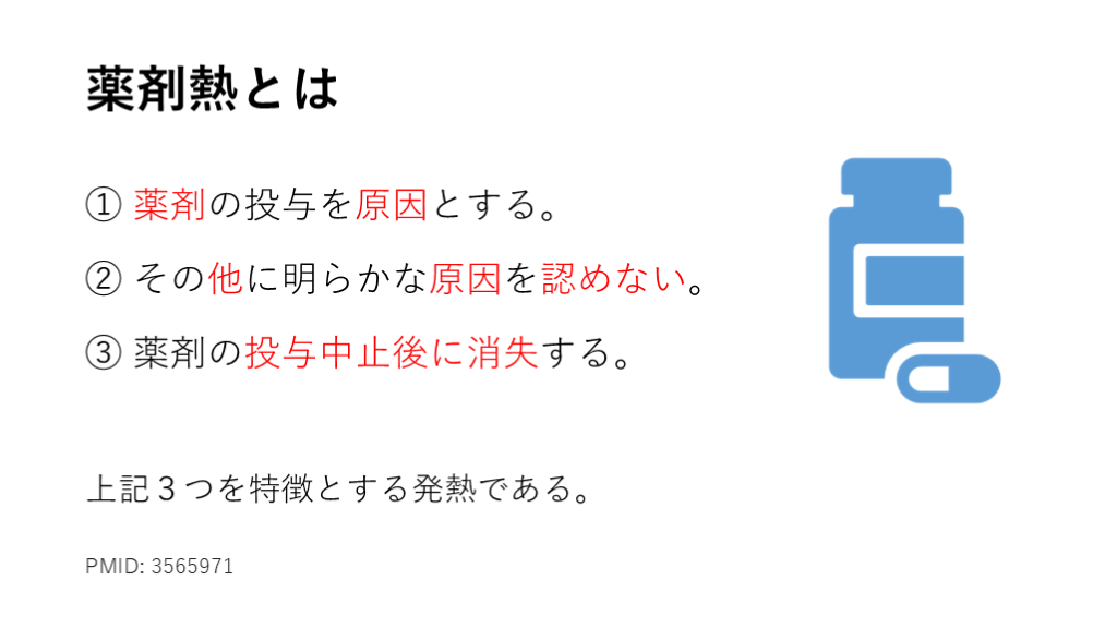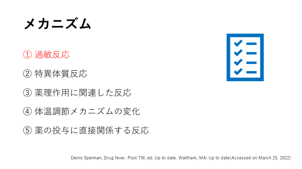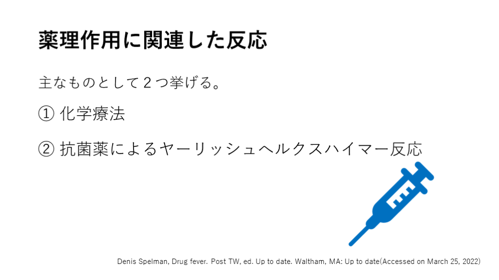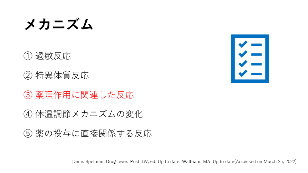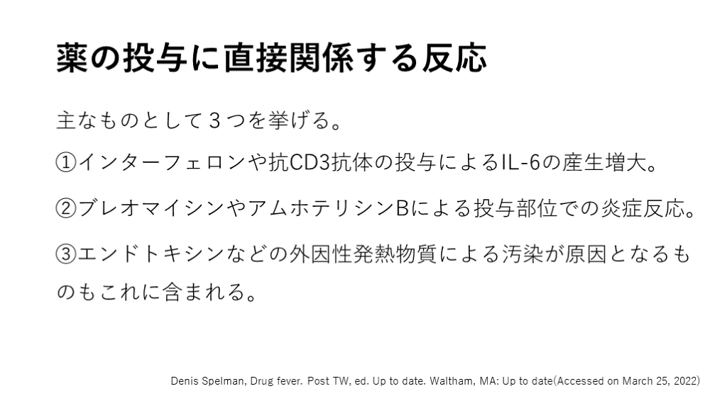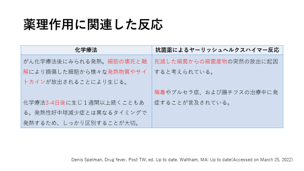 #21. 薬理作用に関連した反応 Denis Spelman, Drug fever. Post TW, ed. Up to date. Waltham, MA: Up to date(Accessed on March 25, 2022)