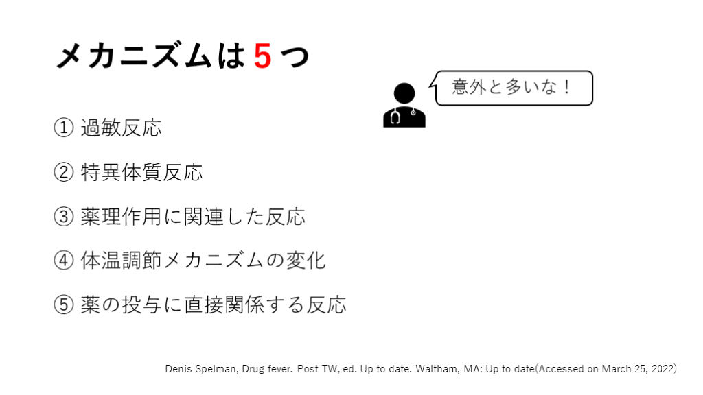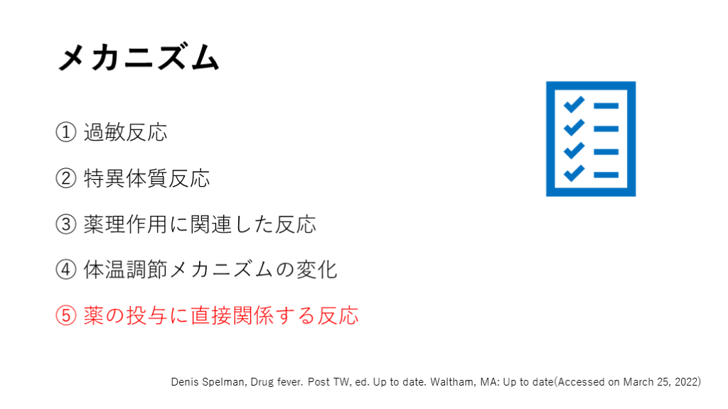 ⑤ 薬の投与に直接関係する反応 意外と多いな! Denis Spelman, Drug fever. Post TW, ed. Up to date. Waltham, MA: Up to date(Accessed on March 25, 2022)