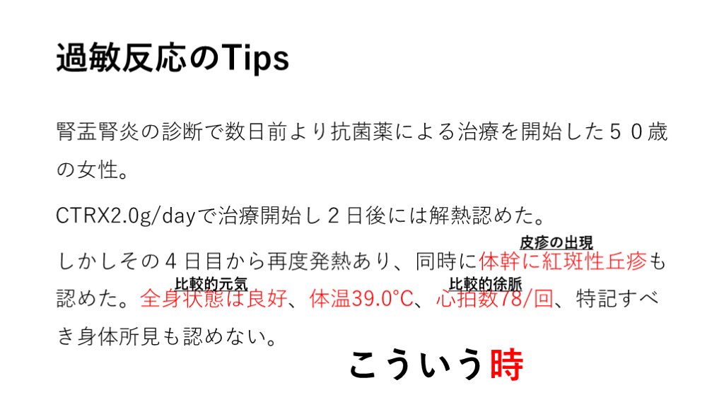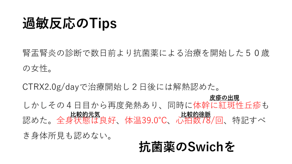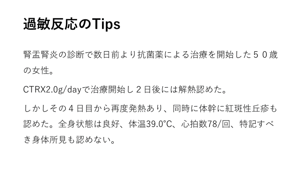 しかしその4日目から再度発熱あり、同時に体幹に紅斑性丘疹も認めた。全身状態は良好、体温39.0℃、心拍数78/回、特記すべき身体所見も認めない。 過敏反応のTips