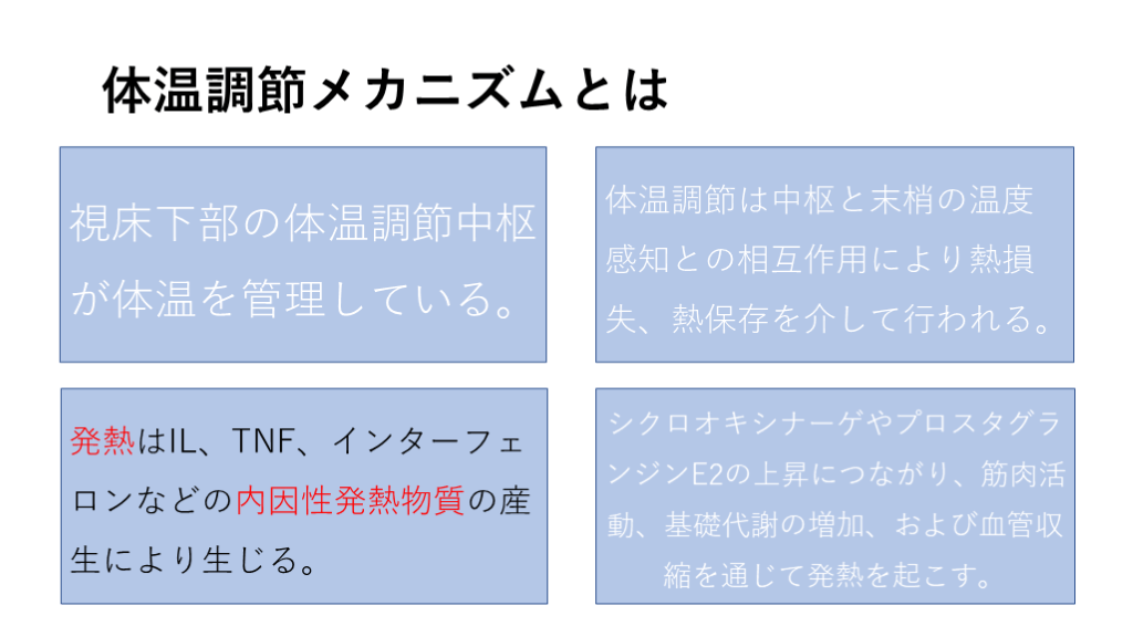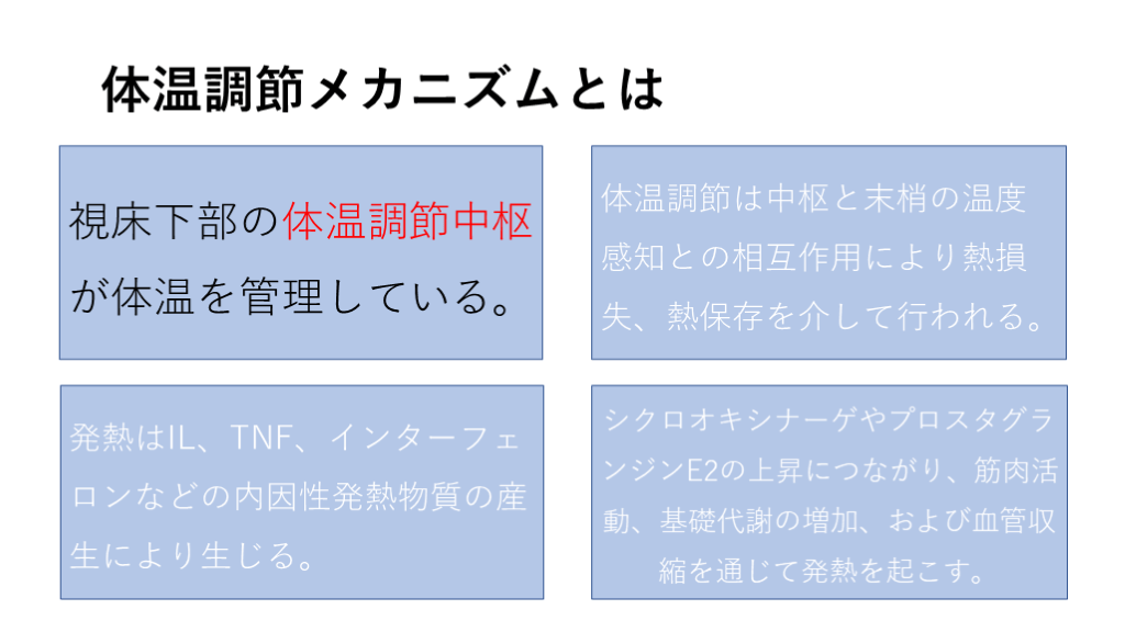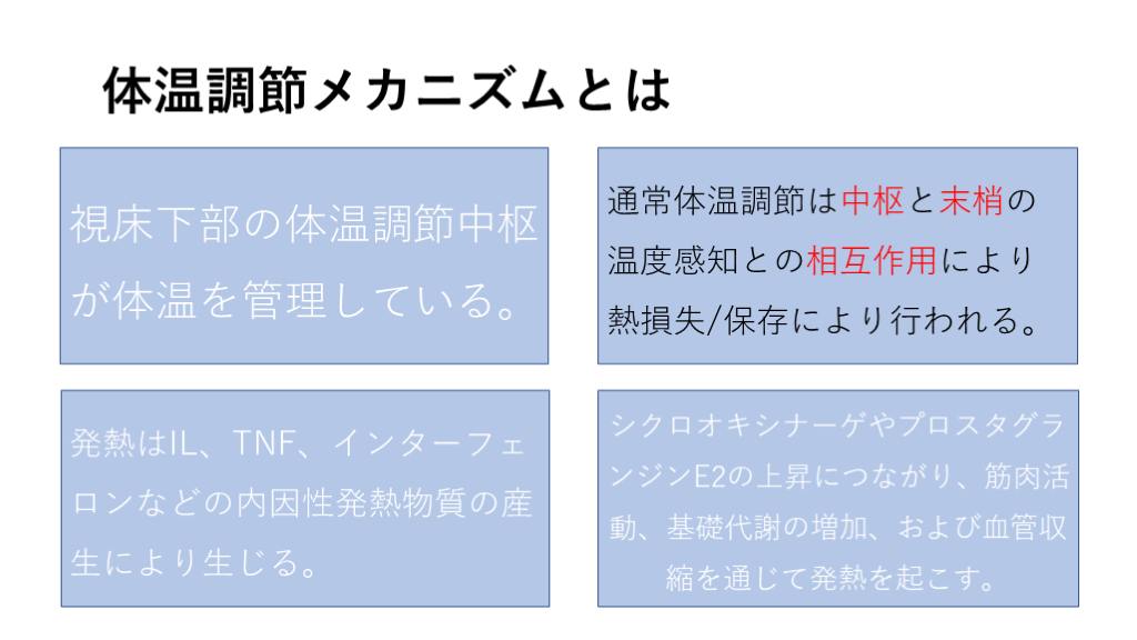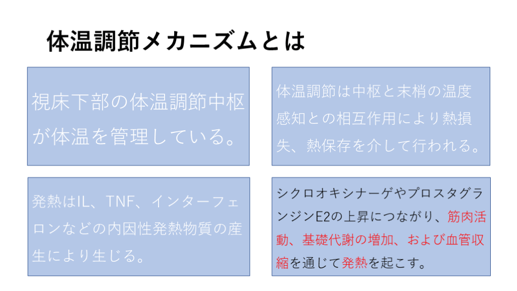#25. 体温調節メカニズムとは 視床下部の体温調節中枢が体温を管理している。 発熱はIL、TNF、インターフェロンなどの内因性発熱物質の産生により生じる。 体温調節は中枢と末梢の温度感知との相互作用により熱損失、熱保存を介して行われる。 シクロオキシナーゲやプロスタグランジンE2の上昇につながり、筋肉活動、基礎代謝の増加、および血管収縮を通じて発熱を起こす。