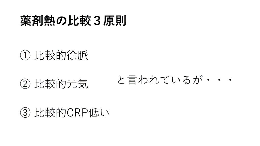 ② 非典型的例を見逃さない、常に頭に薬剤熱の可能性を。