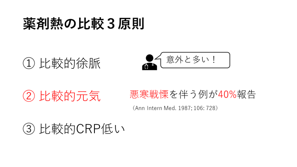 ③ 比較的CRP低い 比較的徐脈(体温40℃で120/回未満、39℃で100/回未満)の頻度は10%程度。