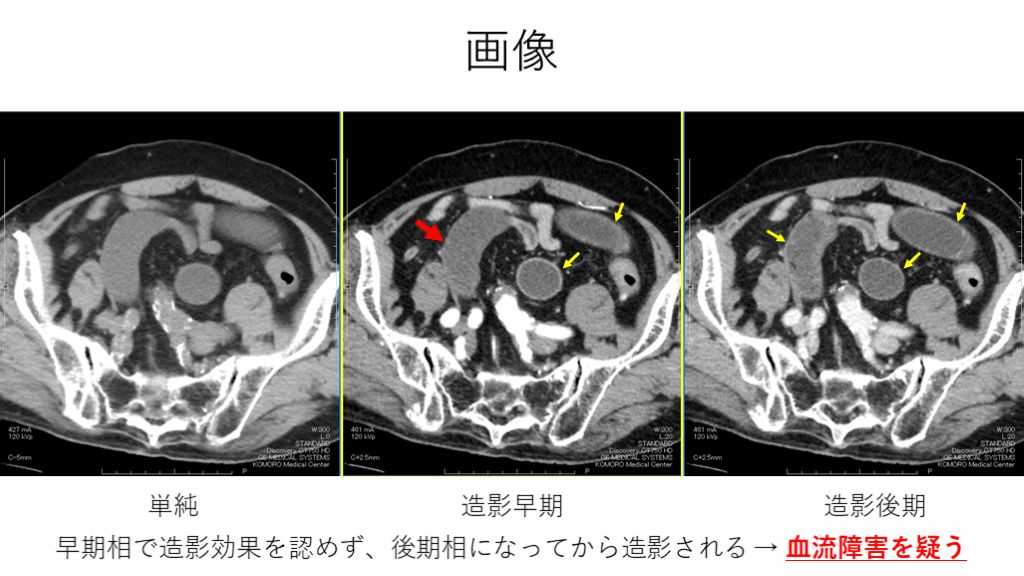 #5. 画像 単純 造影早期 造影後期 早期相で造影効果を認めず、後期相になってから造影される → 血流障害を疑う