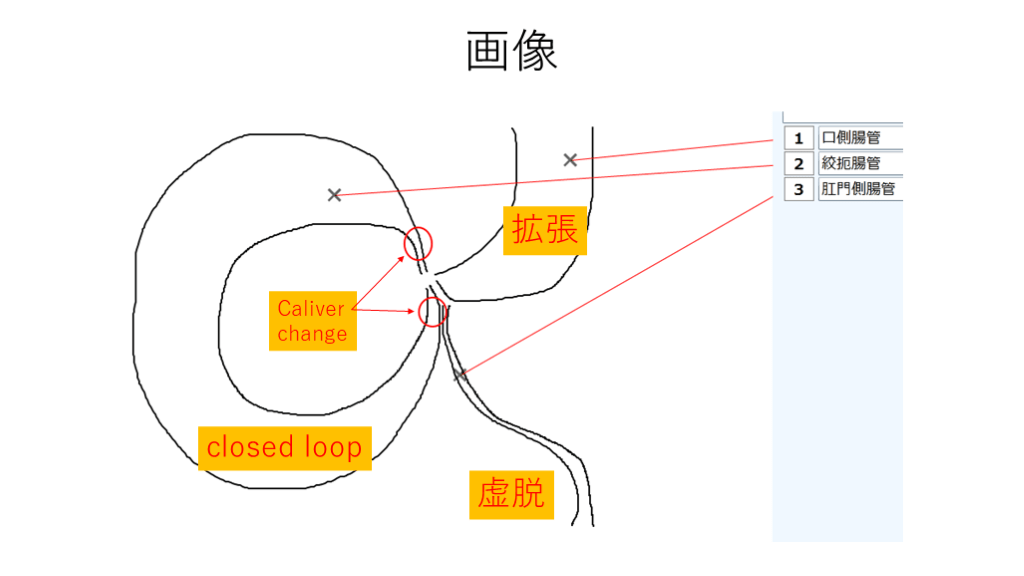 Bowel 腸管 (腸管拡張:小腸3・結腸6・盲腸9cm以上、先細り像の有無)