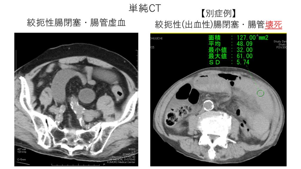 Ischemic 腸管虚血 (疑わしければ造影されている腸管と比較、早期後期の比較も)