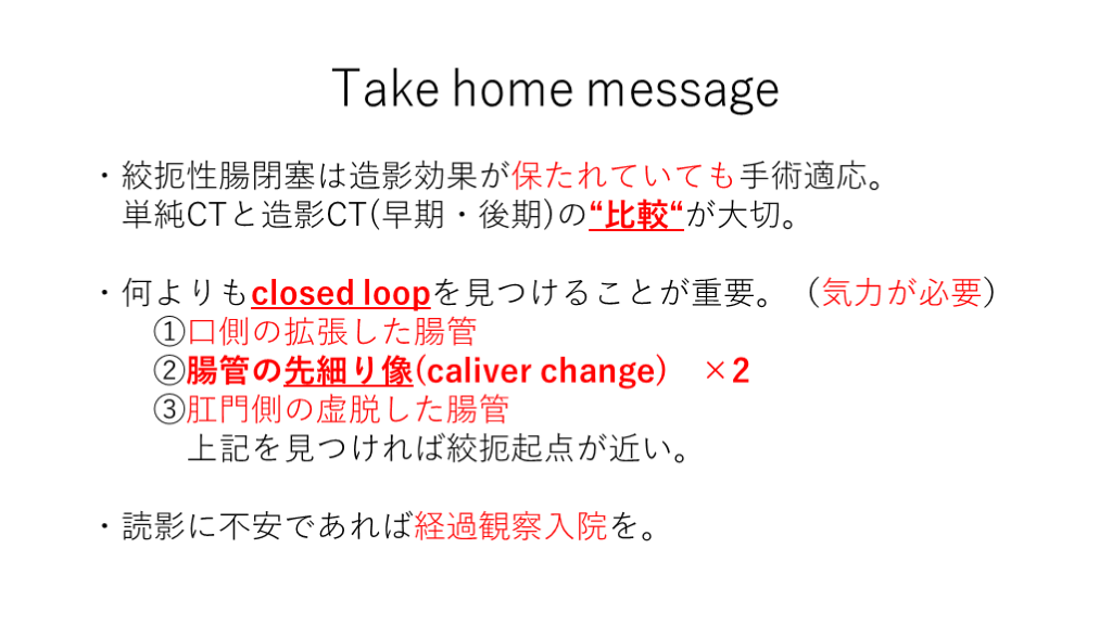 #12. Take home message ・絞扼性腸閉塞は造影効果が保たれていても手術適応。