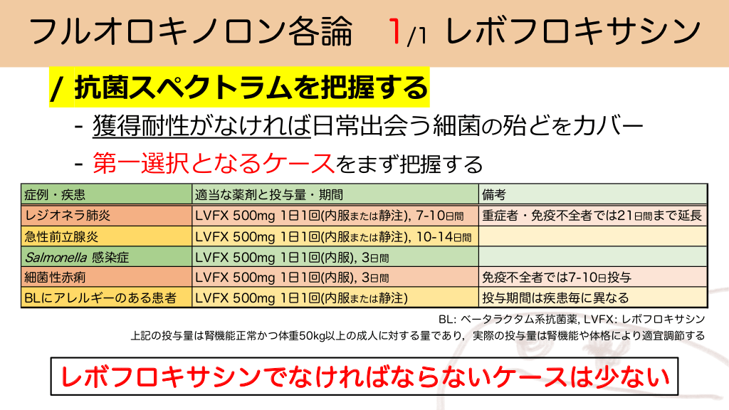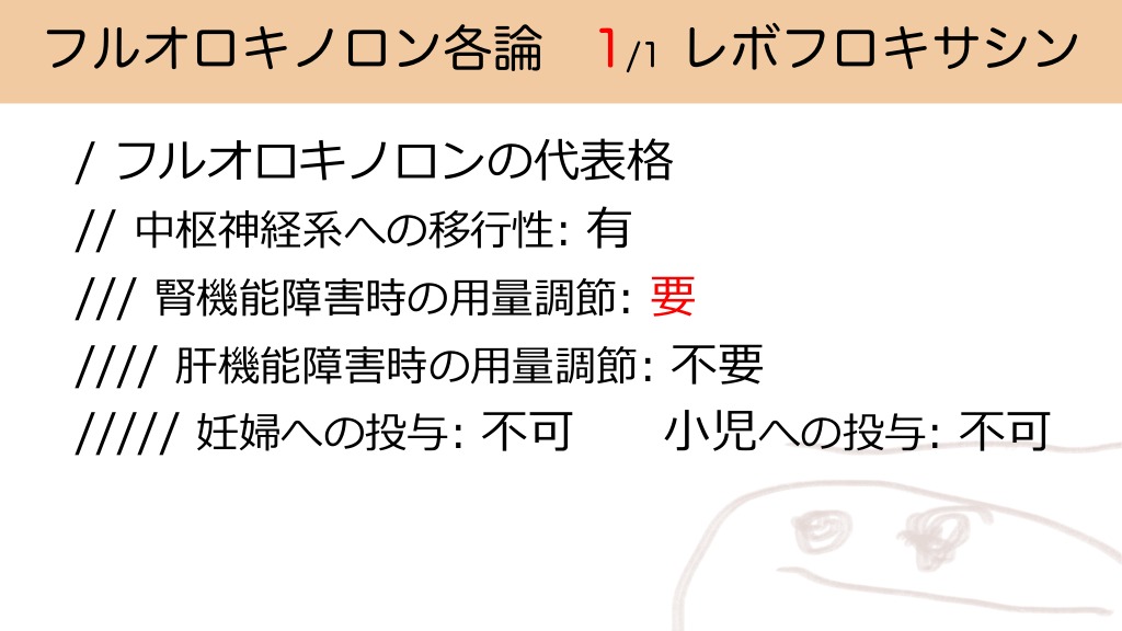 フルオロキノロン各論 1/1 レボフロキサシン / フルオロキノロンの代表格 // 中枢神経系への移⾏性: 有 /// 腎機能障害時の⽤量調節: 要 //// 肝機能障害時の⽤量調節: 不要 ///// 妊婦への投与: 不可 ⼩児への投与: 不可 #10.