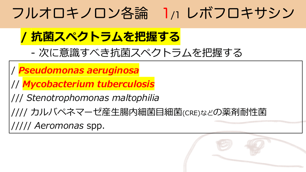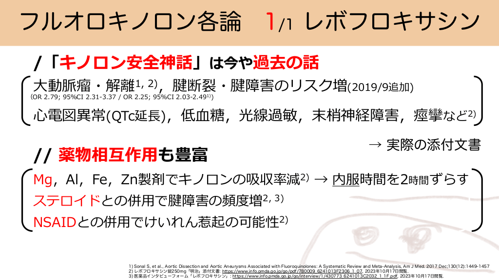 フルオロキノロン各論 1/1 レボフロキサシン / 抗菌スペクトラムを把握する - 次に意識すべき抗菌スペクトラムを把握する / Pseudomonas aeruginosa // Mycobacterium tuberculosis /// Stenotrophomonas maltophilia //// カルバペネマーゼ産⽣腸内細菌⽬細菌(CRE)などの薬剤耐性菌 ///// Aeromonas spp. #12. フルオロキノロン各論 1/1 レボフロキサシン /「キノロン安全神話」は今や過去の話 ⼤動脈瘤・解離1, 2),腱断裂・腱障害のリスク増(2019/9追加) (OR 2.79; 95%CI 2.31-3.37 / OR 2.25; 95%CI 2.03-2.491)) ⼼電図異常(QTc延⻑),低⾎糖,光線過敏,末梢神経障害,痙攣など2) // 薬物相互作⽤も豊富 → 実際の添付文書 Mg,Al,Fe,Zn製剤でキノロンの吸収率減2) → 内服時間を2時間ずらす ステロイドとの併⽤で腱障害の頻度増2, 3) NSAIDとの併⽤でけいれん惹起の可能性2) 1) Sonal S, et al., Aortic Dissection and Aortic Aneurysms Associated with Fluoroquinolones: A Systematic Review and Meta-Analysis, Am J Med. 2017 Dec;130(12):1449-1457 2) レボフロキサシン錠250mg「明治」添付文書: https://www.info.pmda.go.jp/go/pdf/780009̲6241013F2306̲1̲07 , 2023年10月17日閲覧. 3) 医薬品インタビューフォーム「レボフロキサシン」: https://www.info.pmda.go.jp/go/interview/1/430773̲6241013C2032̲1̲1F.pdf , 2023年10月17日閲覧. レボフロキサシンの投与指針と耐性菌のリスク #13.
