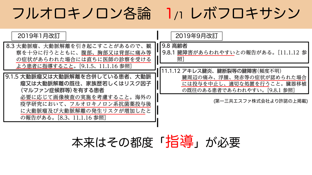 フルオロキノロン各論 1/1 レボフロキサシン 2019年1月改訂 2019年9月改訂 (第一三共エスファ株式会社より許諾の上掲載) 本来はその都度「指導」が必要 #14.