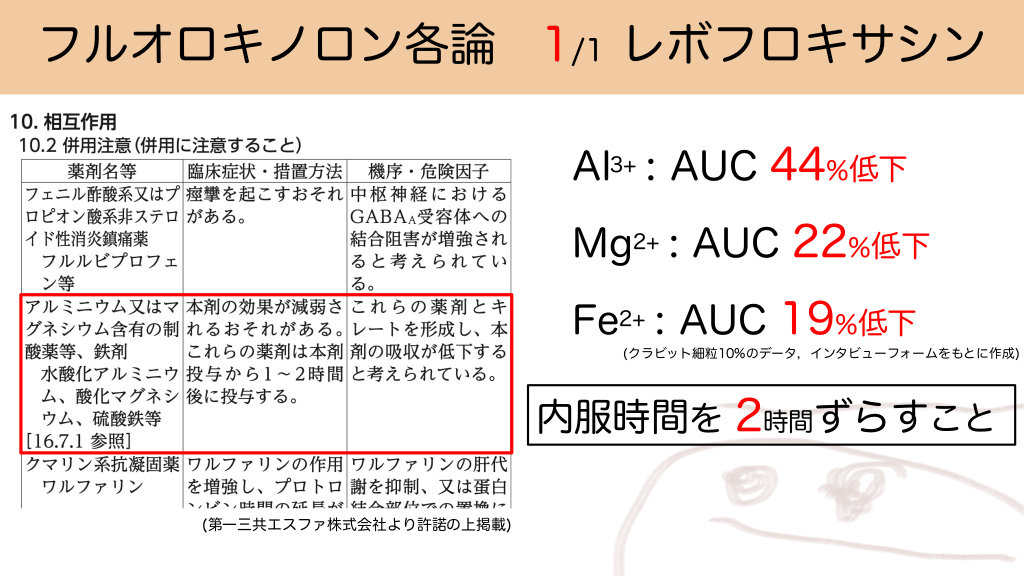 フルオロキノロン各論 1/1 レボフロキサシン Al3+ : AUC 44%低下 Mg2+ : AUC 22%低下 Fe2+ : AUC 19%低下 (クラビット細粒10%のデータ,インタビューフォームをもとに作成) 内服時間を 2時間ずらすこと (第一三共エスファ株式会社より許諾の上掲載) #15.