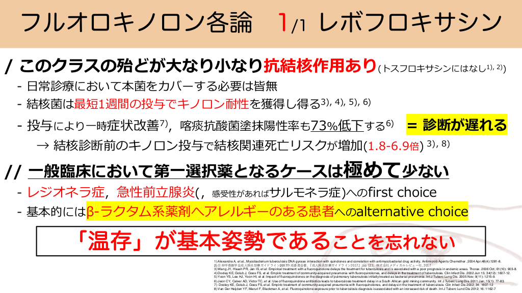 フルオロキノロン各論 1/1 レボフロキサシン / このクラスの殆どが⼤なり⼩なり抗結核作⽤あり(トスフロキサシンにはなし 1), 2)) - ⽇常診療において本菌をカバーする必要は皆無 - 結核菌は最短1週間の投与でキノロン耐性を獲得し得る3), 4), 5), 6) - 投与により⼀時症状改善7),喀痰抗酸菌塗抹陽性率も73%低下する6) = 診断が遅れる → 結核診断前のキノロン投与で結核関連死亡リスクが増加(1.8-6.9倍) 3), 8) // ⼀般臨床において第⼀選択薬となるケースは極めて少ない - レジオネラ症,急性前⽴腺炎(,感受性があればサルモネラ症)へのfirst choice - 基本的にはβ-ラクタム系薬剤へアレルギーのある患者へのalternative choice 「温存」が基本姿勢であることを忘れない 1) Alexandra A, et al., Mycobacterium tuberculosis DNA gyrase: interaction with quinolones and correlation with antimycobacterial drug activity, Antimicrob Agents Chemother. 2004 Apr;48(4):1281-8. 2) ⽇本呼吸器学会成⼈肺炎診療ガイドライン2017作成委員会著, 『成⼈肺炎診療ガイドライン2017』,pp. 123, 株式会社メディカルレビュー社, 2017 3) Wang JY, Hsueh PR, Jan IS, et al: Empirical treatment with a fluoroquinolone delays the treatment for tuberculosis and is associated with a poor prognosis in endemic areas. Thorax. 2006 Oct; 61(10): 903-8. 4) Dooley KE, Golub J, Goes FS, et al: Empiric treatment of community-acquired pneumonia with fluoroquinolones, and delays in the tre テトラサイクリン系抗菌薬の概要と作用 #16.