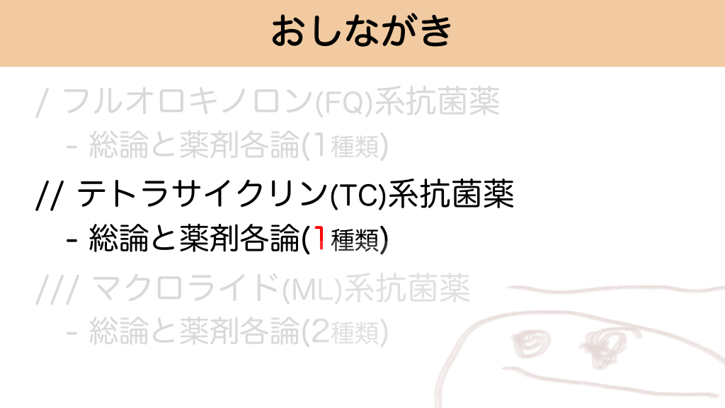 おしながき / フルオロキノロン(FQ)系抗菌薬 - 総論と薬剤各論(1種類) // テトラサイクリン(TC)系抗菌薬 - 総論と薬剤各論(1種類) /// マクロライド(ML)系抗菌薬 - 総論と薬剤各論(2種類) #17.