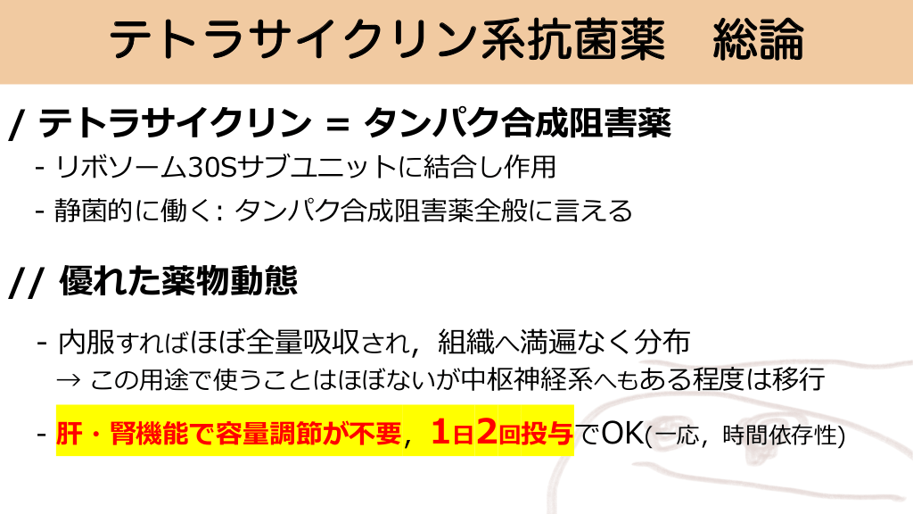 テトラサイクリン系抗菌薬 総論 / テトラサイクリン = タンパク合成阻害薬 - リボソーム30Sサブユニットに結合し作⽤ - 静菌的に働く: タンパク合成阻害薬全般に⾔える // 優れた薬物動態 - 内服すればほぼ全量吸収され,組織へ満遍なく分布 → この⽤途で使うことはほぼないが中枢神経系へもある程度は移⾏ - 肝・腎機能で容量調節が不要,1⽇2回投与でOK(⼀応,時間依存性) #18.