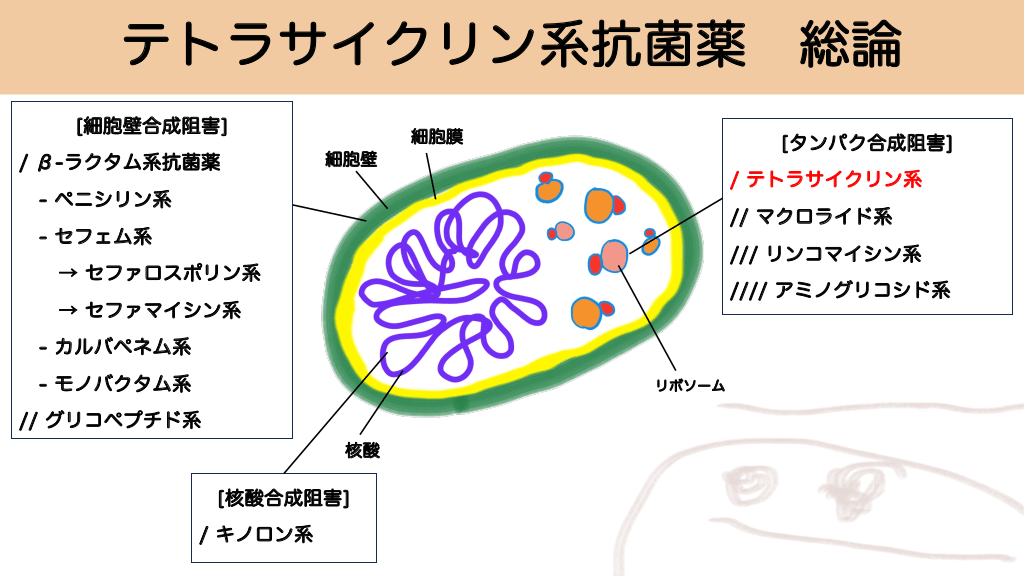 テトラサイクリン系抗菌薬 [細胞壁合成阻害] / β-ラクタム系抗菌薬 細胞膜 総論 [タンパク合成阻害] 細胞壁 / テトラサイクリン系 - ペニシリン系 // マクロライド系 - セフェム系 /// リンコマイシン系 → セファロスポリン系 //// アミノグリコシド系 → セファマイシン系 - カルバペネム系 - モノバクタム系 リボソーム // グリコペプチド系 核酸 [核酸合成阻害] / キノロン系 ドキシサイクリンの適応と使用上の注意 #19.