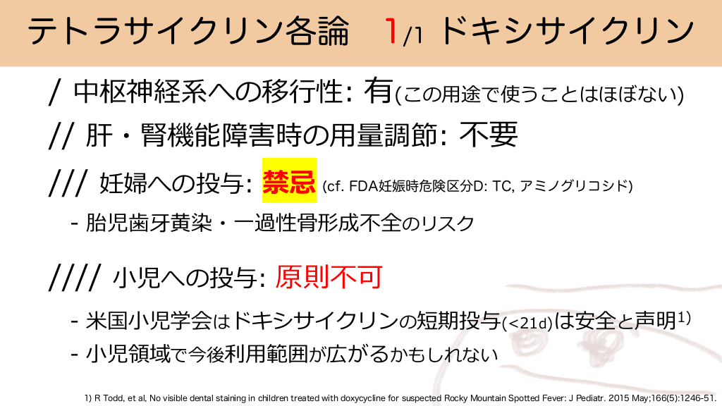 テトラサイクリン各論 1/1 ドキシサイクリン / 中枢神経系への移⾏性: 有(この⽤途で使うことはほぼない) // 肝・腎機能障害時の⽤量調節: 不要 /// 妊婦への投与: 禁忌 (cf. FDA妊娠時危険区分D: TC, アミノグリコシド) - 胎児⻭⽛⻩染・⼀過性⾻形成不全のリスク //// ⼩児への投与: 原則不可 - ⽶国⼩児学会はドキシサイクリンの短期投与(<21d)は安全と声明1) - ⼩児領域で今後利⽤範囲が広がるかもしれない 1) R Todd, et al, No visible dental staining in children treated with doxycycline for suspected Rocky Mountain Spotted Fever: J Pediatr. 2015 May;166(5):1246-51. #20.