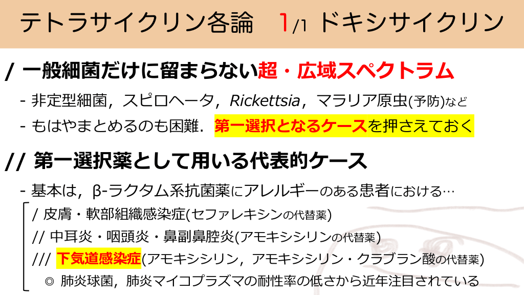 テトラサイクリン各論 1/1 ドキシサイクリン / ⼀般細菌だけに留まらない超・広域スペクトラム - ⾮定型細菌,スピロヘータ,Rickettsia,マラリア原⾍(予防)など - もはやまとめるのも困難.第⼀選択となるケースを押さえておく // 第⼀選択薬として⽤いる代表的ケース - 基本は,β-ラクタム系抗菌薬にアレルギーのある患者における… / ⽪膚・軟部組織感染症(セファレキシンの代替薬) // 中⽿炎・咽頭炎・⿐副⿐腔炎(アモキシシリンの代替薬) /// 下気道感染症(アモキシシリン,アモキシシリン・クラブラン酸の代替薬) ◎ 肺炎球菌,肺炎マイコプラズマの耐性率の低さから近年注⽬されている #21.