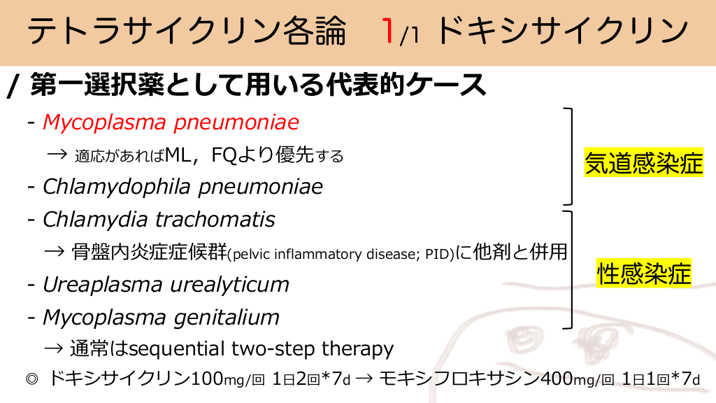 テトラサイクリン各論 1/1 ドキシサイクリン / 第⼀選択薬として⽤いる代表的ケース - Mycoplasma pneumoniae → 適応があればML,FQより優先する - Chlamydophila pneumoniae 気道感染症 - Chlamydia trachomatis → ⾻盤内炎症症候群(pelvic inflammatory disease; PID)に他剤と併⽤ - Ureaplasma urealyticum 性感染症 - Mycoplasma genitalium → 通常はsequential two-step therapy ◎ ドキシサイクリン100mg/回 1⽇2回*7d → モキシフロキサシン400mg/回 1⽇1回*7d #22.