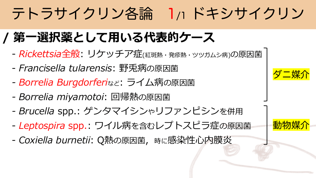 テトラサイクリン各論 1/1 ドキシサイクリン / 第⼀選択薬として⽤いる代表的ケース - Rickettsia全般: リケッチア症(紅斑熱・発疹熱・ツツガムシ病)の原因菌 - Francisella tularensis: 野兎病の原因菌 - Borrelia Burgdorferiなど: ライム病の原因菌 ダニ媒介 - Borrelia miyamotoi: 回帰熱の原因菌 - Brucella spp.: ゲンタマイシンやリファンピシンを併⽤ - Leptospira spp.: ワイル病を含むレプトスピラ症の原因菌 - Coxiella burnetii: Q熱の原因菌,時に感染性⼼内膜炎 動物媒介 #23.