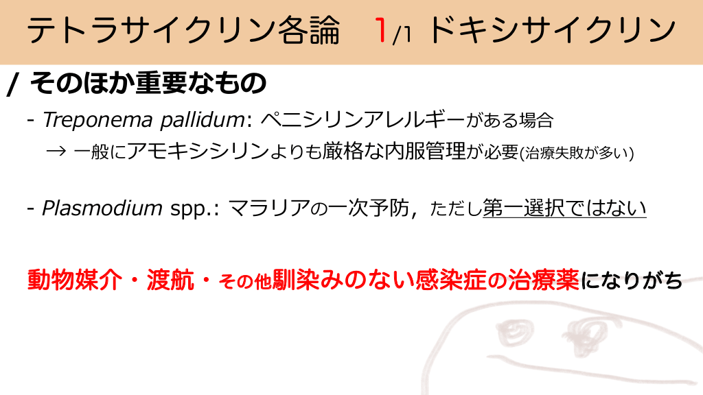 テトラサイクリン各論 1/1 ドキシサイクリン / そのほか重要なもの - Treponema pallidum: ペニシリンアレルギーがある場合 → ⼀般にアモキシシリンよりも厳格な内服管理が必要(治療失敗が多い) - Plasmodium spp.: マラリアの⼀次予防,ただし第⼀選択ではない 動物媒介・渡航・その他馴染みのない感染症の治療薬になりがち #24.