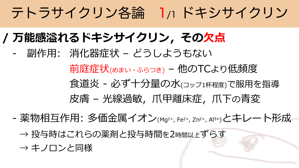 テトラサイクリン各論 1/1 ドキシサイクリン / 万能感溢れるドキシサイクリン,その⽋点 - 副作⽤: 消化器症状 – どうしようもない 前庭症状(めまい・ふらつき) – 他のTCより低頻度 ⾷道炎 - 必ず⼗分量の⽔(コップ1杯程度)で服⽤を指導 ⽪膚 – 光線過敏,⽖甲離床症,⽖下の⻘変 - 薬物相互作⽤: 多価⾦属イオン(Mg 2+, とキレート形成 Fe2+, Zn2+, Al3+) → 投与時はこれらの薬剤と投与時間を2時間以上ずらす → キノロンと同様 テトラサイクリン系抗菌薬の運用と選択基準 #25.
