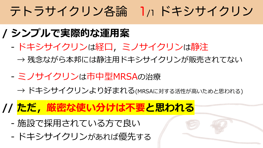 テトラサイクリン各論 1/1 ドキシサイクリン / シンプルで実際的な運⽤案 - ドキシサイクリンは経⼝,ミノサイクリンは静注 → 残念ながら本邦には静注⽤ドキシサイクリンが販売されてない - ミノサイクリンは市中型MRSAの治療 → ドキシサイクリンより好まれる(MRSAに対する活性が⾼いためと思われる) // ただ,厳密な使い分けは不要と思われる - 施設で採⽤されている⽅で良い - ドキシサイクリンがあれば優先する #26.