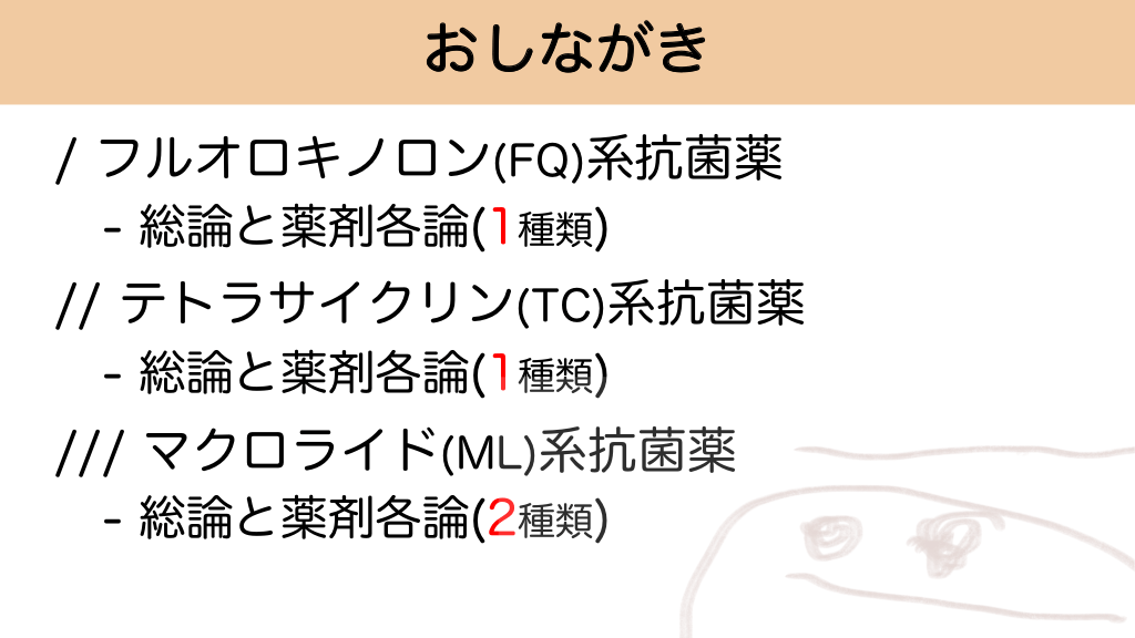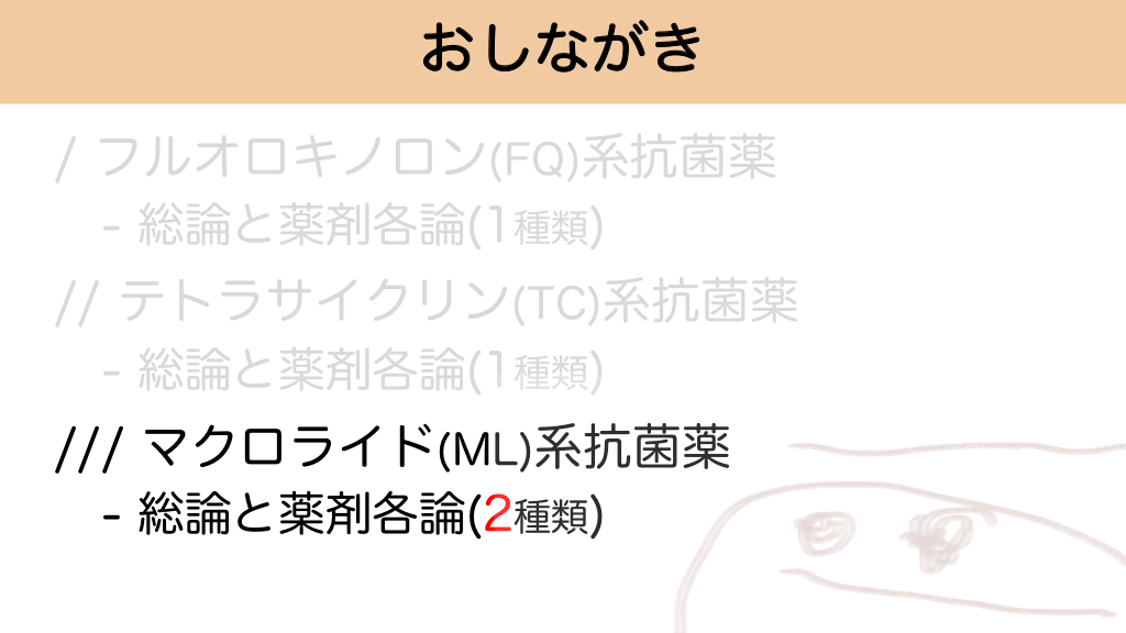 おしながき / フルオロキノロン(FQ)系抗菌薬 - 総論と薬剤各論(1種類) // テトラサイクリン(TC)系抗菌薬 - 総論と薬剤各論(1種類) /// マクロライド(ML)系抗菌薬 - 総論と薬剤各論(2種類) マクロライド系抗菌薬の概要と耐性問題 #27.