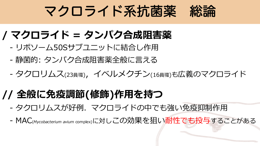 マクロライド系抗菌薬 総論 / マクロライド = タンパク合成阻害薬 - リボソーム50Sサブユニットに結合し作⽤ - 静菌的: タンパク合成阻害薬全般に⾔える - タクロリムス(23員環),イベルメクチン(16員環)も広義のマクロライド // 全般に免疫調節(修飾)作⽤を持つ - タクロリムスが好例.マクロライドの中でも強い免疫抑制作⽤ - MAC(Mycobacterium avium complex)に対しこの効果を狙い耐性でも投与することがある #28.