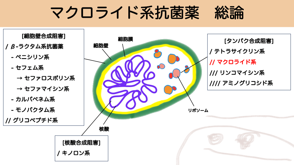 マクロライド系抗菌薬 [細胞壁合成阻害] / β-ラクタム系抗菌薬 細胞膜 総論 [タンパク合成阻害] 細胞壁 / テトラサイクリン系 - ペニシリン系 // マクロライド系 - セフェム系 /// リンコマイシン系 → セファロスポリン系 //// アミノグリコシド系 → セファマイシン系 - カルバペネム系 - モノバクタム系 リボソーム // グリコペプチド系 核酸 [核酸合成阻害] / キノロン系 #29.