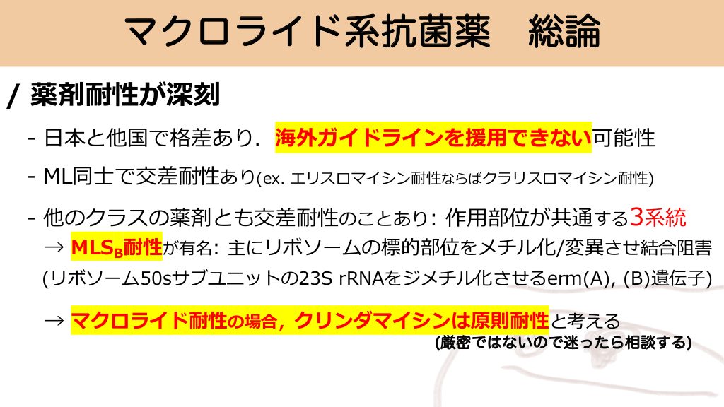 マクロライド系抗菌薬 総論 / 薬剤耐性が深刻 - ⽇本と他国で格差あり.海外ガイドラインを援⽤できない可能性 - ML同⼠で交差耐性あり(ex. エリスロマイシン耐性ならばクラリスロマイシン耐性) - 他のクラスの薬剤とも交差耐性のことあり: 作⽤部位が共通する3系統 → MLSB耐性が有名: 主にリボソームの標的部位をメチル化/変異させ結合阻害 (リボソーム50sサブユニットの23S rRNAをジメチル化させるerm(A), (B)遺伝⼦) → マクロライド耐性の場合,クリンダマイシンは原則耐性と考える (厳密ではないので迷ったら相談する) #30.