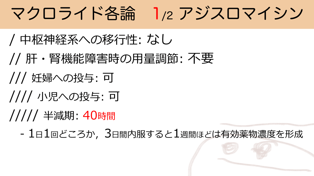 マクロライド各論 1/2 アジスロマイシン / 中枢神経系への移⾏性: なし // 肝・腎機能障害時の⽤量調節: 不要 /// 妊婦への投与: 可 //// ⼩児への投与: 可 ///// 半減期: 40時間 - 1⽇1回どころか,3⽇間内服すると1週間ほどは有効薬物濃度を形成 アジスロマイシンの適応と副作用 #31.