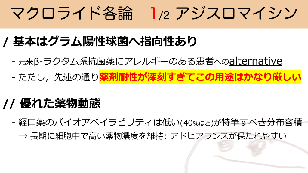 マクロライド各論 1/2 アジスロマイシン / 基本はグラム陽性球菌へ指向性あり - 元来β-ラクタム系抗菌薬にアレルギーのある患者へのalternative - ただし,先述の通り薬剤耐性が深刻すぎてこの⽤途はかなり厳しい // 優れた薬物動態 - 経⼝薬のバイオアベイラビリティは低い(40%ほど)が特筆すべき分布容積 → ⻑期に細胞中で⾼い薬物濃度を維持: アドヒアランスが保たれやすい #32.